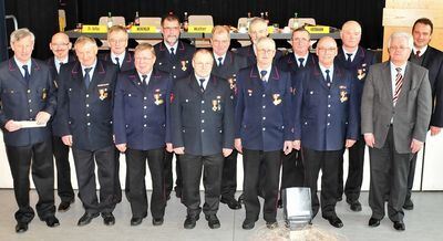 Kreisbrandmeister Karl Hermann (links) mit den ausgezeichneten Feuerwehrleuten, dem scheidenden Kreisfeuerwehr-Bürgermeister Manfred Hofelich (zweiter von rechts) und Landrat Joachim Walter (ganz außen).