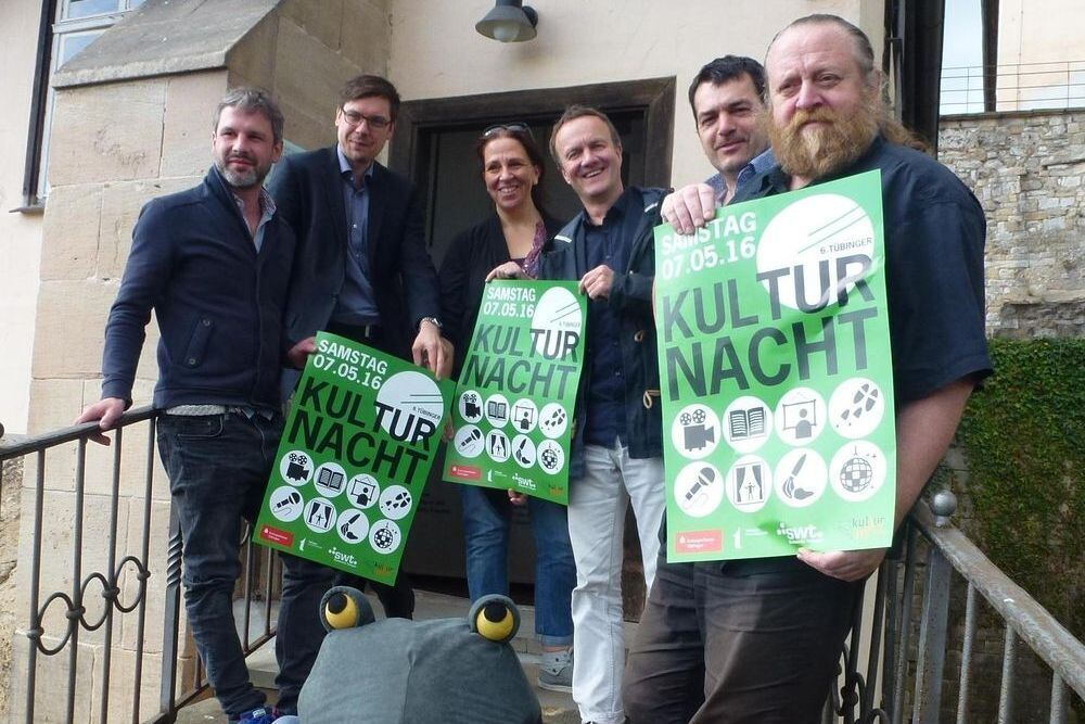Die Macher der Tübinger Kulturnacht (von links): Leiter Felix Schmidt, Frank Dürr, Leiter Museum Alte Kulturen, Inken Bachmann von der VHS, LTT-Intendant Thorsten Weckherlin, Jürgen Zeiselmeier und Adalbert Sedelmeier, beide vom Kulturnetz Tübingen und einer der Frösche, die immer wieder durchs Programm hüpfen. GEA-FOTO: AL