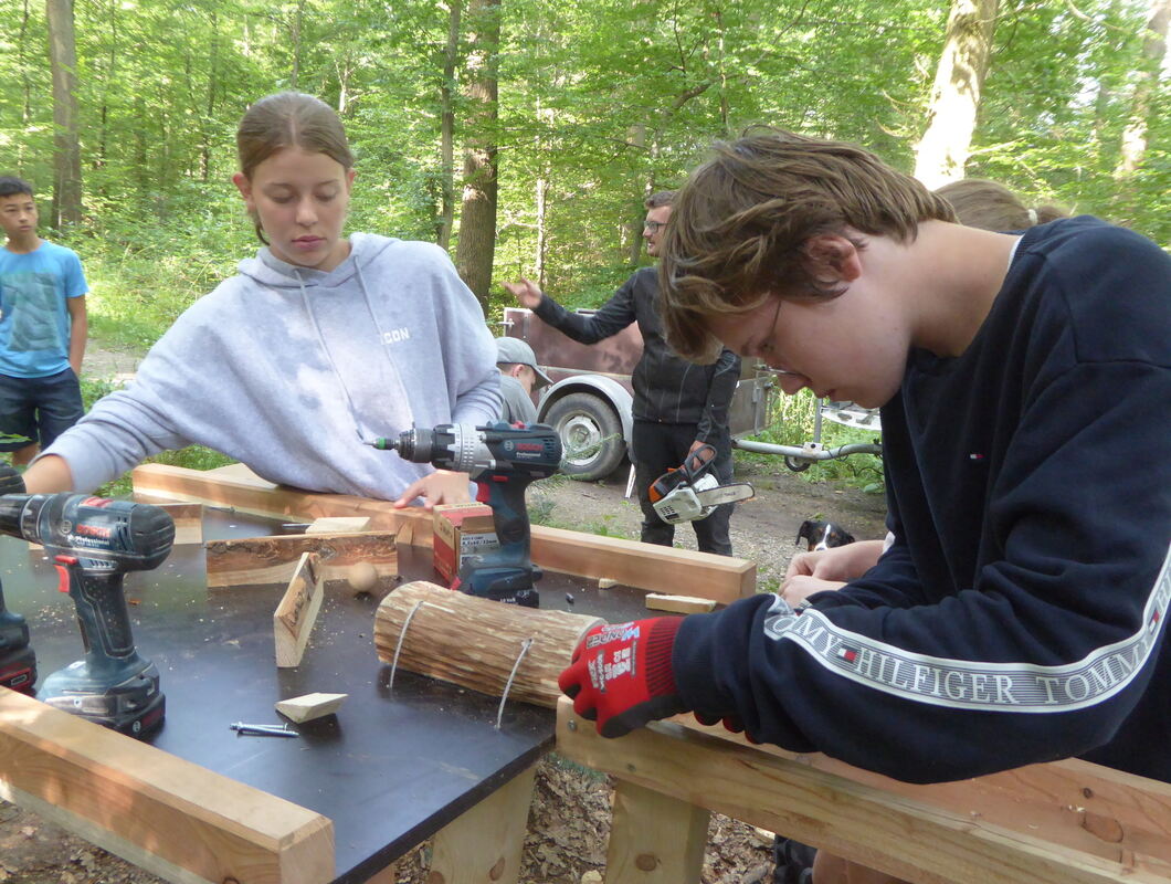 Schüler bauen eine Kugelbahn im Kusterdinger Wald
