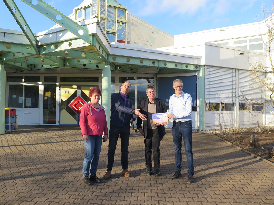 Monika Schober, Sebastian Kämper, Dr. Martin Ulmer und Rektor Karsten Rechentin (von links) präsentieren die unterzeichnete Partnerschaftsurkunde. Nun soll das KvFG noch stärker vom Know-how der Geschichtswerkstatt profitieren.