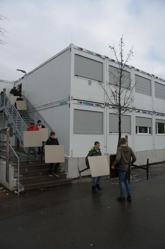 Schüler der 8b der Mössinger List-Schule ziehen vom Container-Ersatzbau zurück ins sanierte Schulgebäude, tragen erst ihre Tische rüber. Stühle, Bücher und andere Lernmaterialien folgen später. Rektor Udo Kranich (oben, links) wacht über den Umzugs-Tross. FOTO: MERKLE