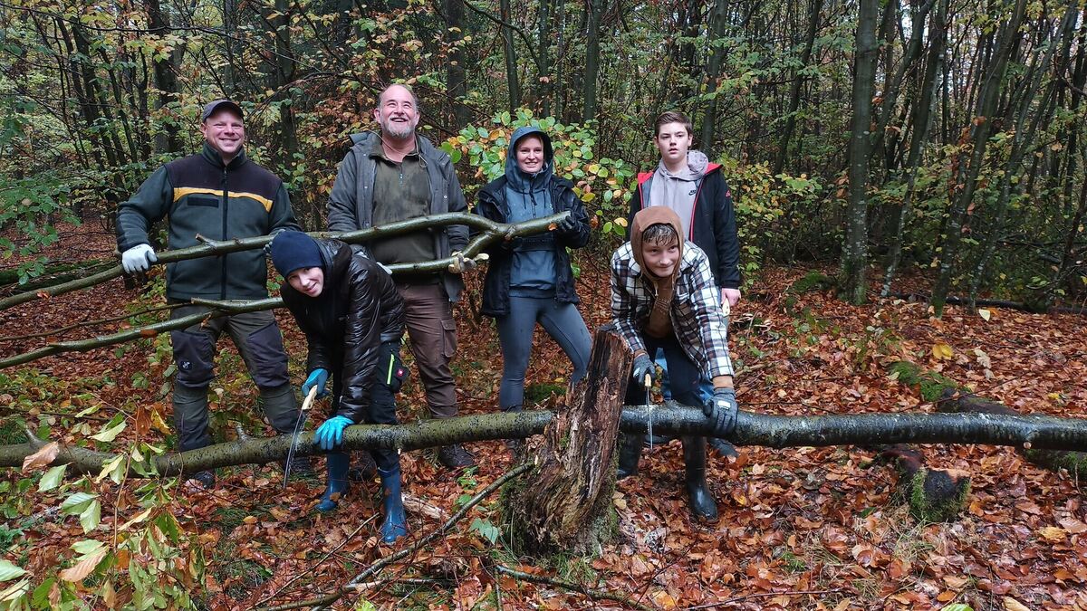 von links: Förster Christian Koch und die Lehrkräfte Daniel Vött und Noemi Tröster unterstützten die Schüler bei den Waldarbeiten.