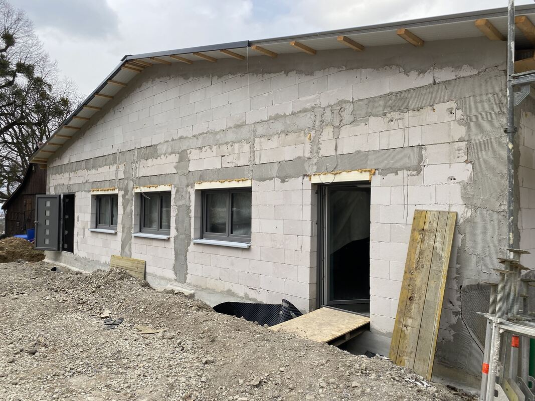 Die Fenster sind in dem fortgeschrittenen Rohbau schon eingebaut.
