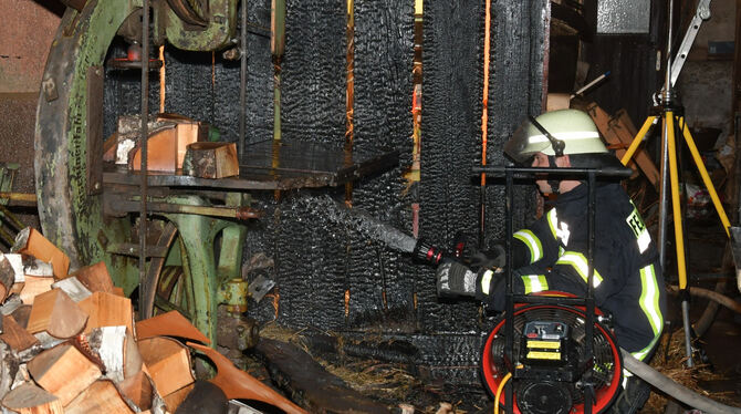 Mit einem schnellen und massiven Löschangriff, auch über die Drehleiter, gelang es den Helfern, die Flammen unter Kontrolle zu bekommen. Ein Trupp bekämpfte das brennende Heu unter dem Dach. In dem mit viel Holz und landwirtschaftlichem Gerät voll gestellten Hof verletzte sich ein Feuerwehrmann beim Löscheinsatz. Er wurde vom Notarzt und einer DRK-Rettungswagenbesatzung versorgt. Weitere Kräfte standen in Bereitschaft, darunter die Feuerwehr Kiebingen. (GEA)
