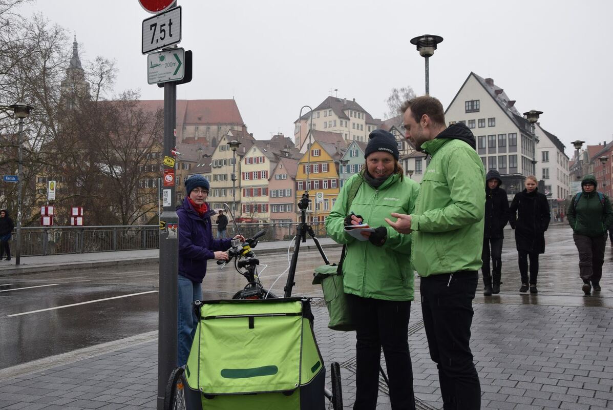 Vorne am Lenker wird die Luft angesaugt. Das mobile Messgerät befindet sich im Anhänger des E-Bikes. Von rechts: Daniel Moser, Ulrike Beck und Katja Bigge an der Tübinger Neckarbrücke. GEA-FOTO: -JK