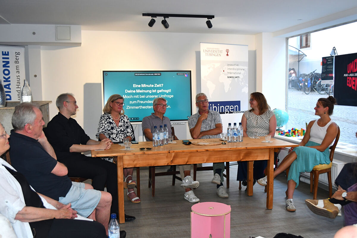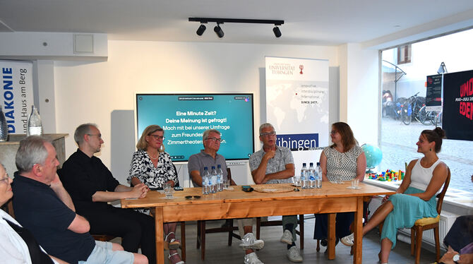 Am Tisch von links nach rechts: der scheidende Zimmertheater-Geschäftsführer Roman Pertl, Kulturbürgermeisterin Dr. Gundula Schäfer-Vogel, Moderator Prof. Dr. Claus Claussen, Jochen Gewecke vom Freundeskreis LTT, Dr. Karin Bürkert (Ludwig-Uhland Institut) und Paula Zimmermann (Jugendgemeinderat). FOTO: SCHERTLIN