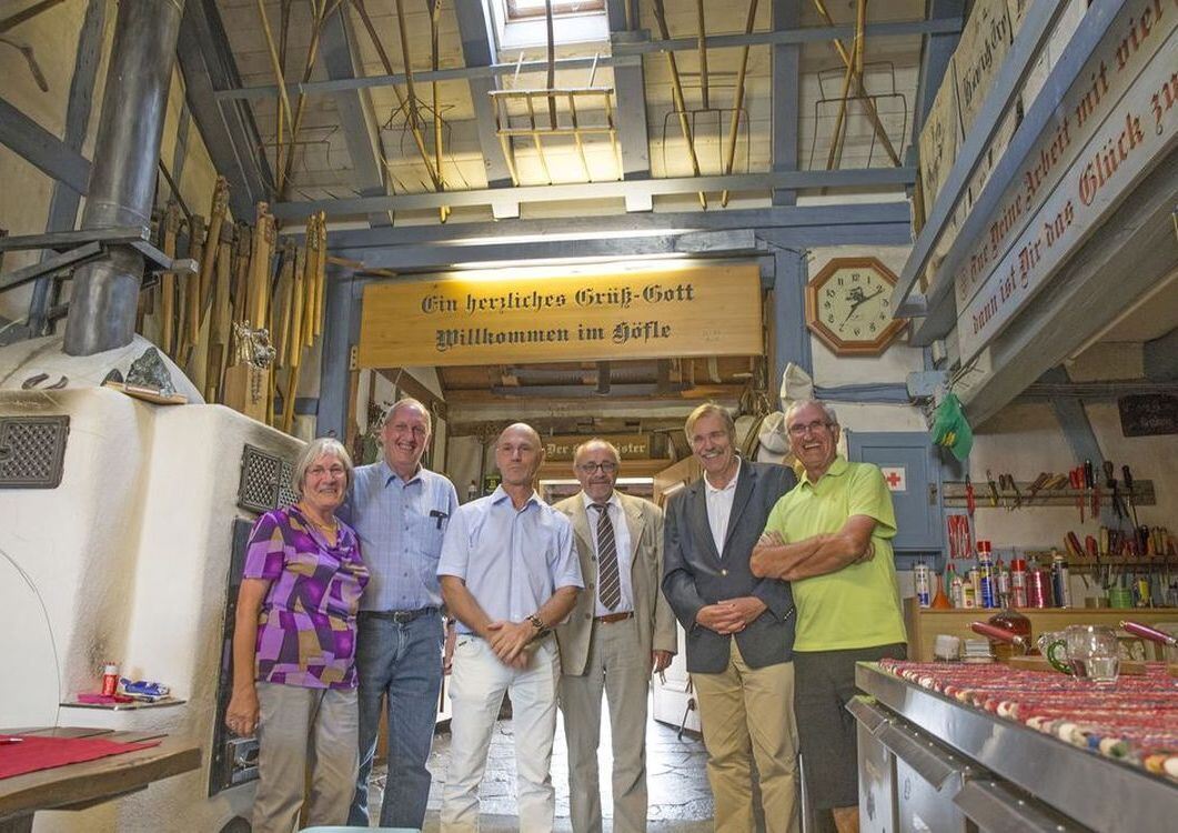 Lohnender Rundgang in Jettenburg: (von links) Grete und Hans Kern vom Geschichtsverein Härten, Hausherr Matthias Bader, Hartmut Witte und Hubert Wicker vom Förderverein Schwäbischer Dialekt und Verleger Willi Kemmler.