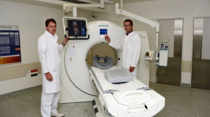 Professor Ulrich Stöckle (links) und Oberarzt Oliver Luz präsentieren den neuen Computertomografen der BG Klinik Tübingen.