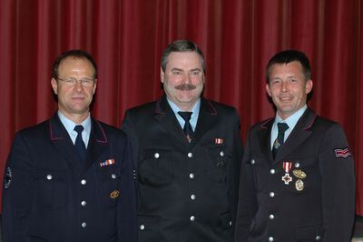 Kommandant Wilfried Boll (von links) mit Dietmar Schneck (30 Jahre Dienst) und Jörg Kautt (Ehrenzeichen in Silber).