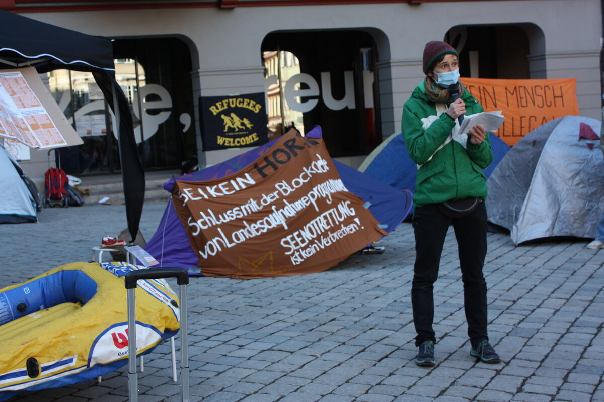 TÜBINGEN. Von Samstag auf Sonntag standen einfache Zelte vor dem Tübinger Rathaus, daneben ein ramponiert aussehendes Gummiboot. Damit wies die Tübinger Ortsgruppe der bundesweit agierenden Organisation Seebrücke auf die Not von Menschen hin, die über das Mittelmeer nach Europa flüchten wollen, weil sie in ihrer Heimat von Krieg und Armut bedroht sind.