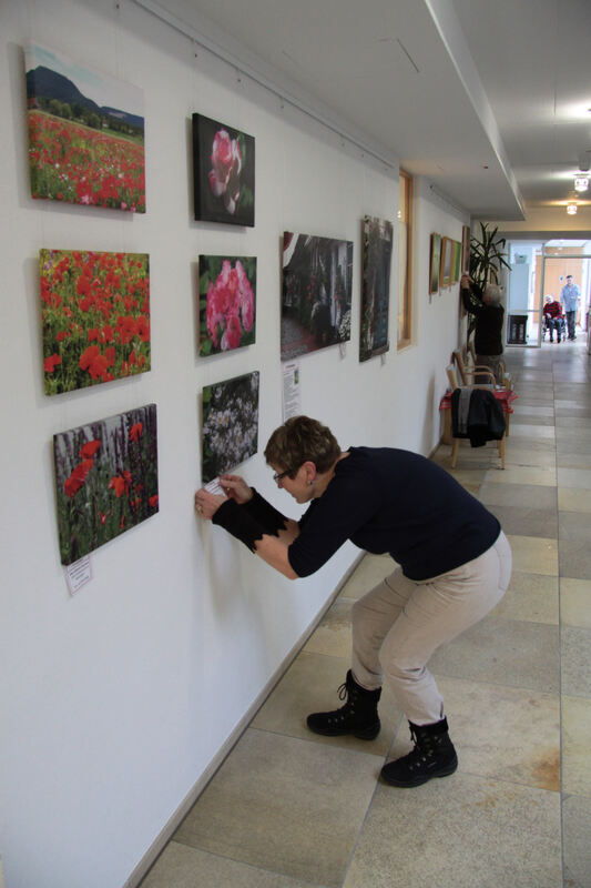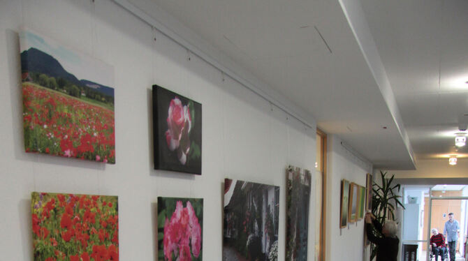 Die ART Mössingen zeigt fünf Wechselausstellungen rings ums Atrium im Haus an der Steinlach, hier sind Klara Dittrich-Rommel (vorne) und Heidemarie Messner noch mit dem Hängen der Bilder und Anbringen der erläuternden Schilder befasst. FOTO: MERKLE