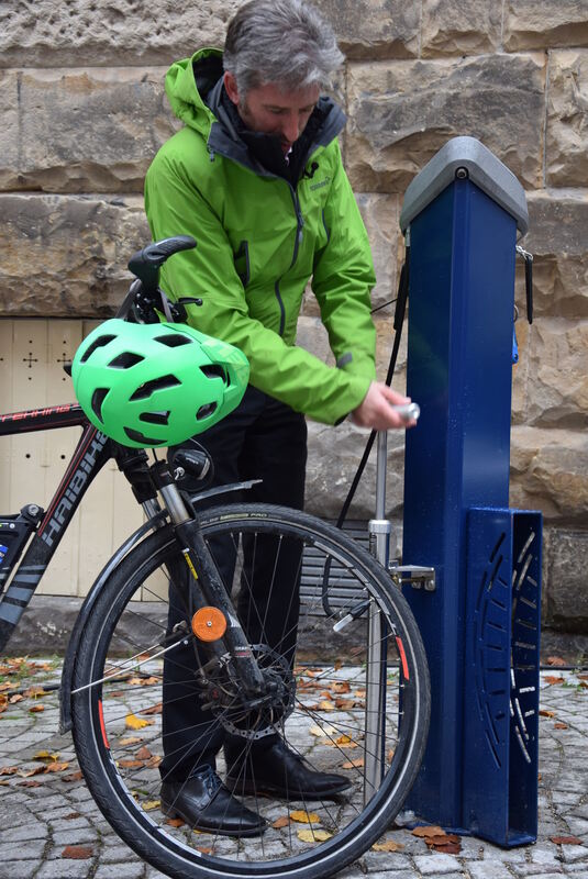 OB Boris Palmer an der neuen Radservice-Station beim Rathaus. Foto: Stöhr