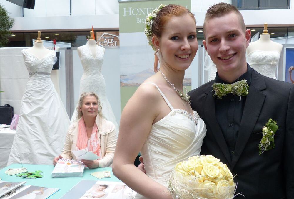 Modischer Blumenschmuck für die Trauung: Larissa Killinger und Falk Speier zeigten sich als Modelle auf der Hochzeitsmesse. Privat sind sie frisch verliebt und seit drei Monaten ein Paar. FOTO: WEBER