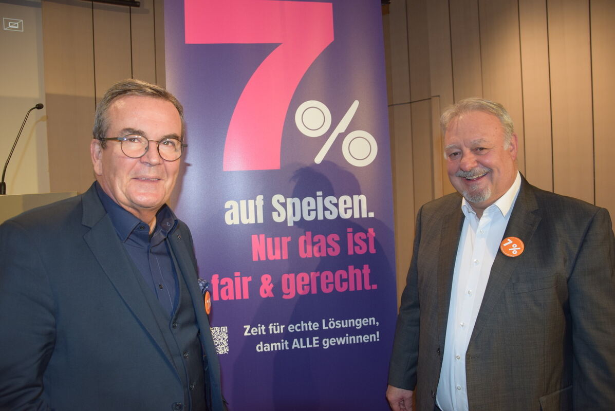 Ein kleiner Anstecker am Revers und ein großes Banner: Fritz Engelhardt, Vorsitzender des Hotel- und Gaststättenverbands Dehoga Baden-Württemberg, und Herbert Rösch (rechts) vom Kreisverband Tübingen ließen keinen Zweifel, worauf die Gastronomie inständig hofft.
