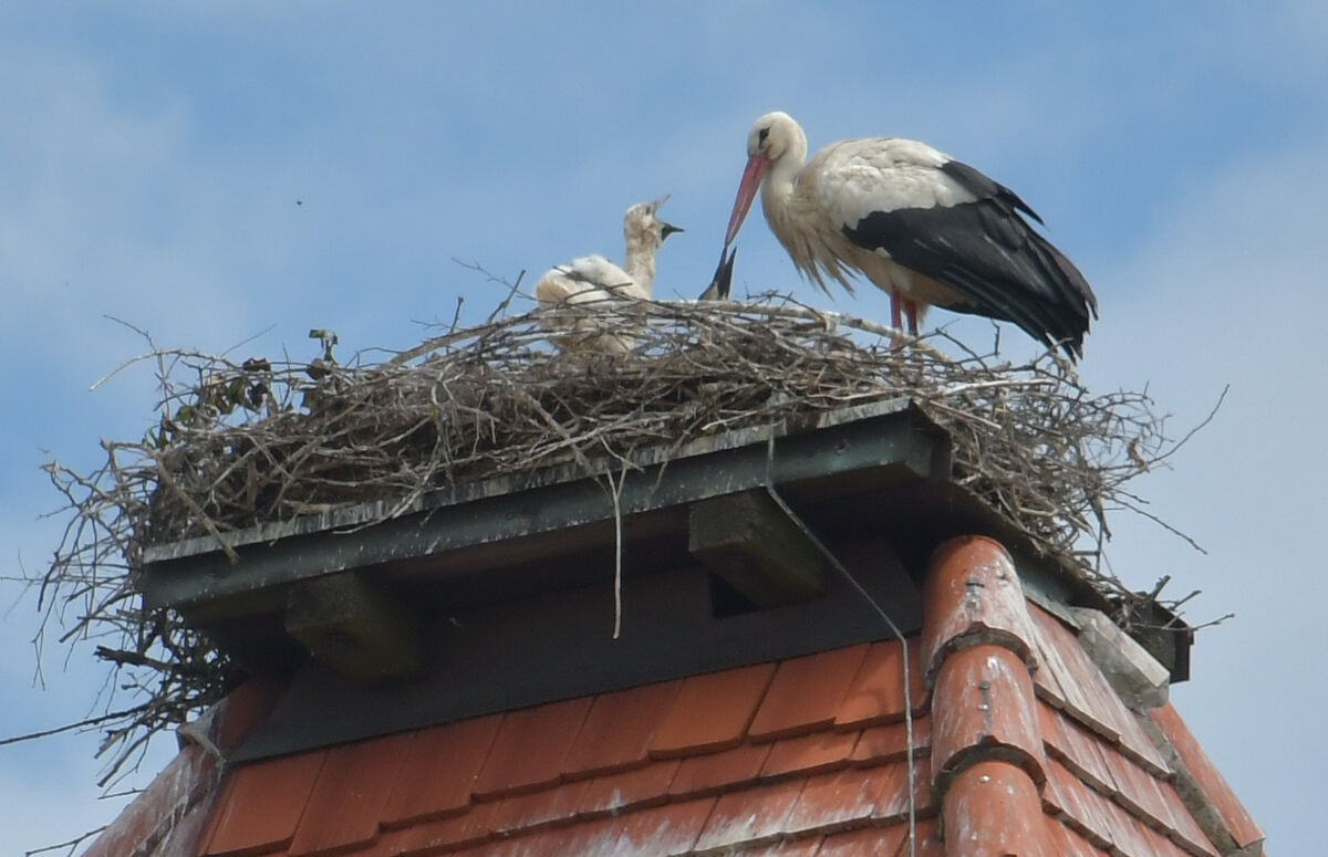 Siebenköpfige Storchen-Familie auf Kirche in Hechingen