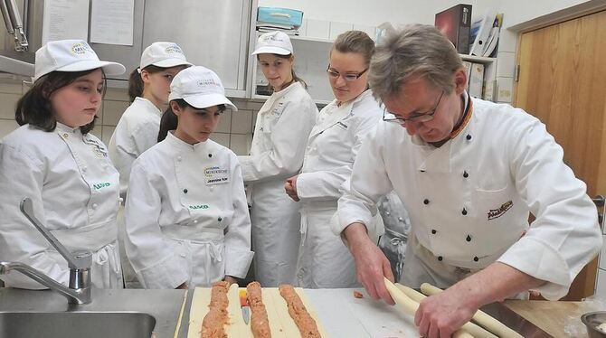 Gerhard Mayer zeigt Miniköchen von der Alb in seiner Küche in Mähringen, wie man einen Hackfleischzopf zubereitet.