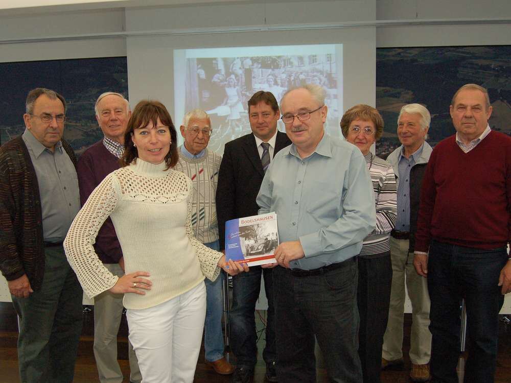Sabine Engeser und Kurt Lacher (im Vordergrund) präsentieren den neuen Bildband, im Hintergrund stehen die Redaktionsmitglieder und Bürgermeister Uwe Ganzenmüller. FOTO: ULP