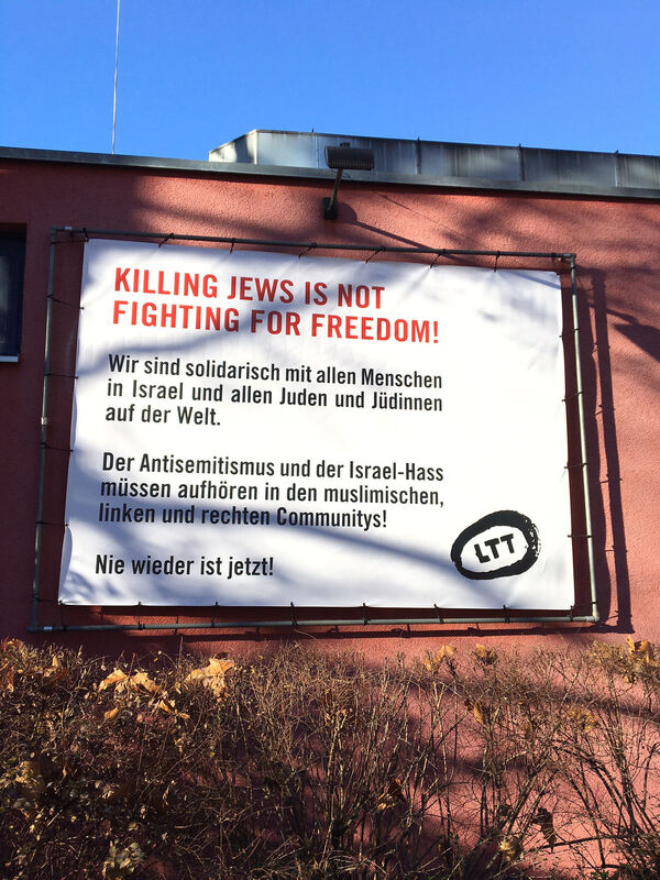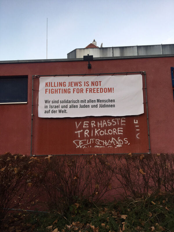 TÜBINGEN. Wieder ist es passiert. Nachdem die Israel-Flagge am Tübinger Rathaus vor etwa einem Monat abgerissen wurde, hat es nun einen Aushang am Landestheater Tübingen (LTT) erwischt. Die drei mal vier Meter große Leinwand überlebte nur 16 Stunden. Sie wurde zerschnitten. Die Schmierereien darunter waren schon vorher an der Wand.