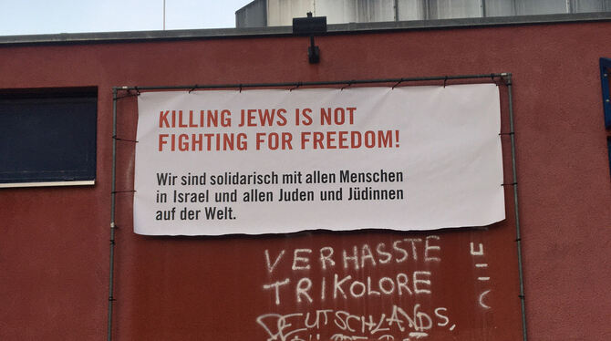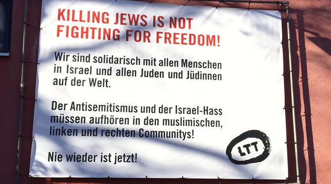 TÜBINGEN. Wieder ist es passiert. Nachdem die Israel-Flagge am Tübinger Rathaus vor etwa einem Monat abgerissen wurde, hat es nun einen Aushang am Landestheater Tübingen (LTT) erwischt. Die drei mal vier Meter große Leinwand überlebte nur 16 Stunden. Sie wurde zerschnitten. Die Schmierereien darunter waren schon vorher an der Wand.