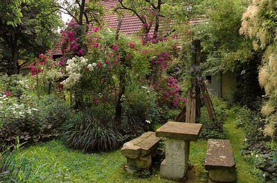 Verwunschene Ecken wie diesen Sitzplatz gibt es im Garten der Gaebeles zu entdecken.