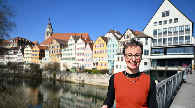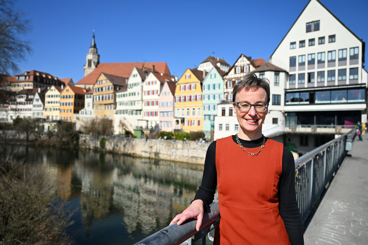 Sofie Geisel, die Kandidatin der SPD für die Wahl zum Oberbürhermeister in Tübingen, aufgenommen auf der Neckarbrücke mit der Kulisse der Altstadt.