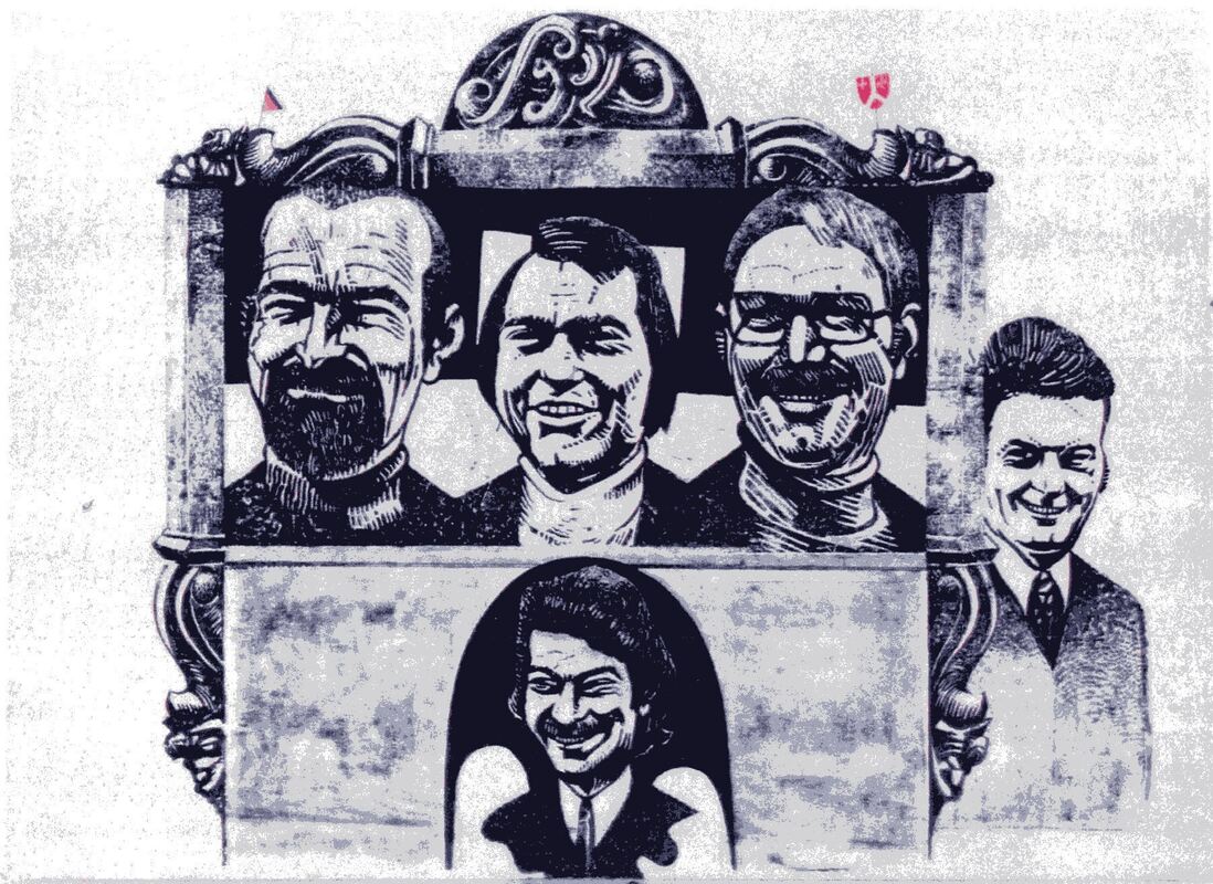 Die Zeichnung von Günter Hildebrand stammt von Mitte der 1970er-Jahre. Sie zeigt die Gemeinderäte und Ortsvereinsmitglieder Hennig Hahn, Dieter Kress und Eugen Kuhnle. Darunter ist der Landtagsabgeordnete Roland Hahn zu sehen, am rechten Rand der CDU-Landtags-Abgeordnete Gerhard Weng.