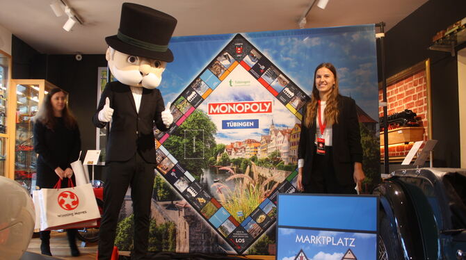 Tomke Buhl (links) und Sarina Hartmann stellten die Tübinger City-Edition gemeinsam mit »Mr. Monopoly« im Museum Boxenstopp vor.