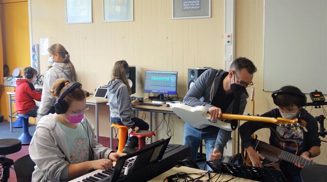 Kooperation Jugendmusikschule mit der Merian-Gemeinschaftsschule auf dem Höhnisch: Eine Schülerin sitzt am E-Piano, Musiklehrer Sven Edler ist am Bass und die Kinder üben konzentriert. FOTO: STRAUB
