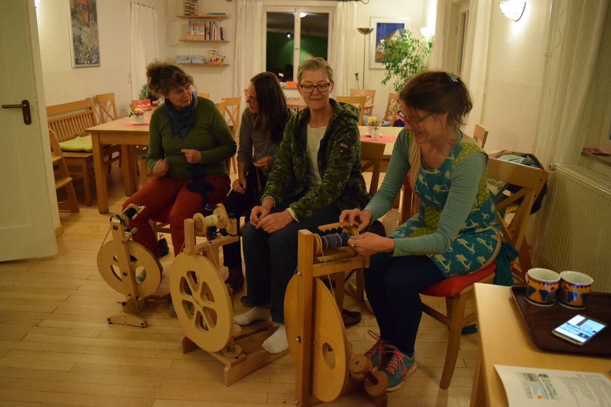 Mit Geschick und dem nötigen Handwerkszeug den Faden fürTextilien selbst schaffen – im monatlichen Spinnkreis im Mössinger MüZe ist das möglich. Hier sind mit dabei (von links): Ulli Pfeiffer, Petra Nüllen, Ulrike Schäfer und Saskia Mertens. FOTO: JAENSCH