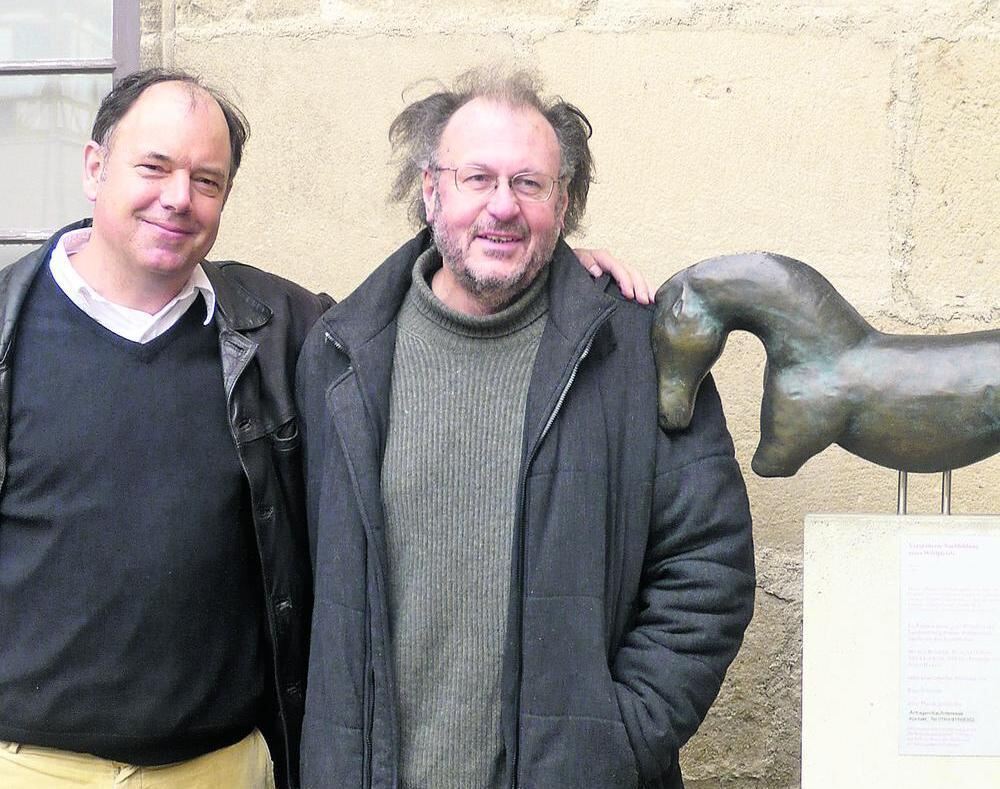 Ausgräber Nicholas Conard (links) und Literaturwissenschaftler Jürgen Wertheimer auf dem Tübinger Schloss vor einer stark vergrößerten Replik des Wildpferdchens vom Vogelherd. FOTO: KNAUS-VERLAG