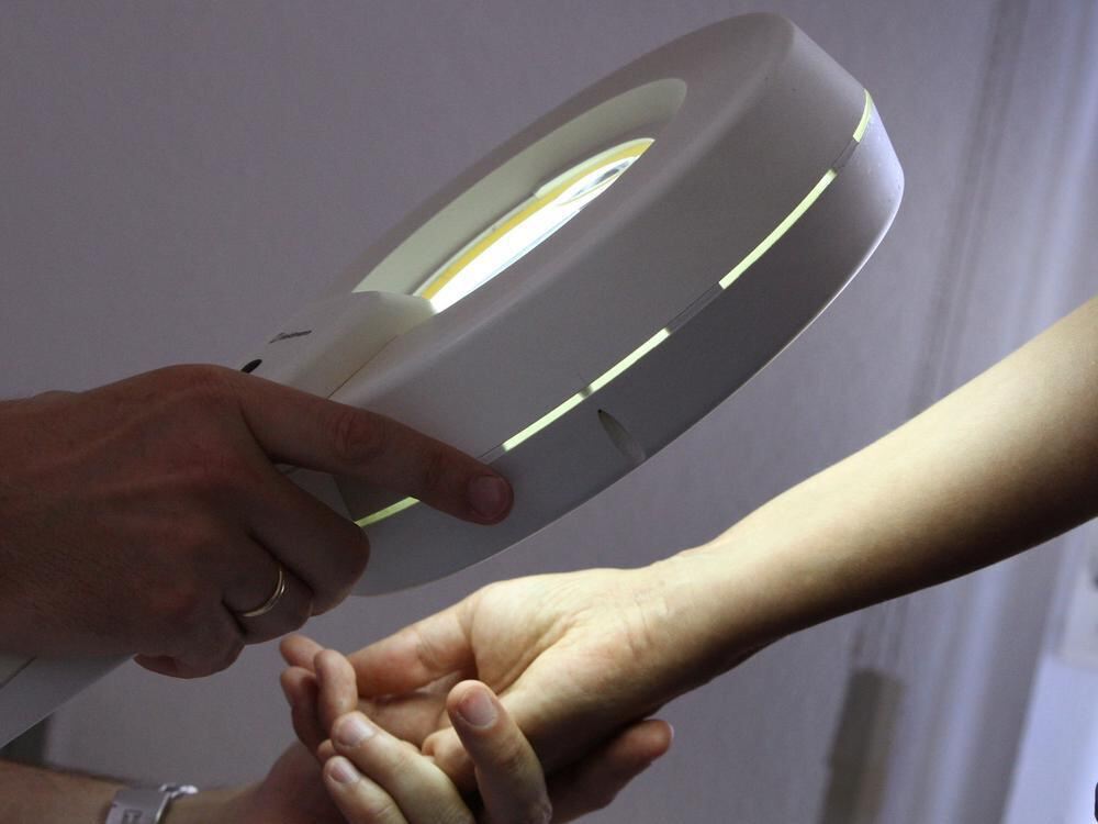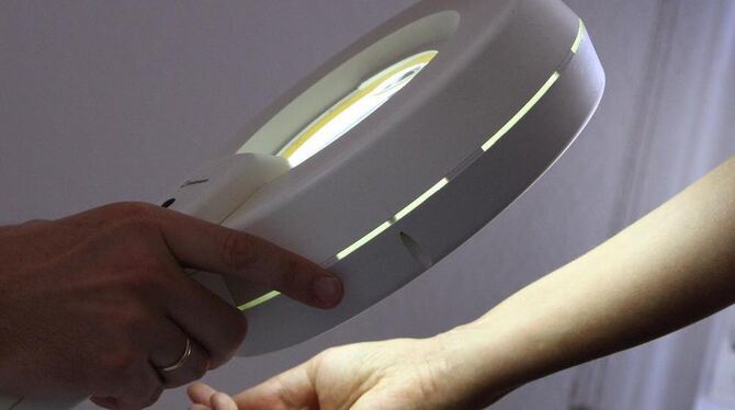 Ein Hautarzt untersucht mit einem Vergrößerungsglas die Haut einer Patientin bei einer Hautkrebs-Früherkennung (Archivfoto).