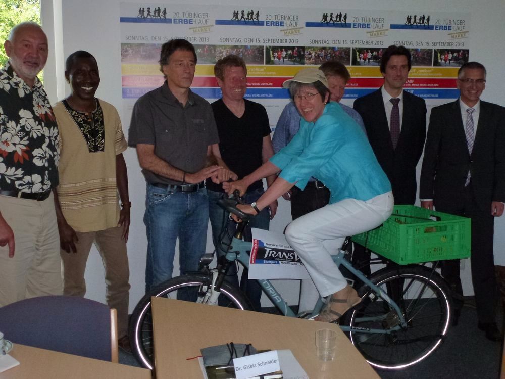 Difäm-Direktorin Gisela Schneider im Kreis von Organisatoren und Sponsoren des Tübinger Stadtlaufs auf dem E-Bike, das es bei der Tombola zu gewinnen gibt.