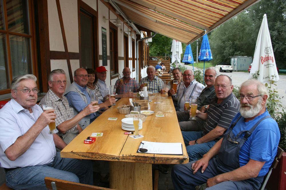 Hier gibt’s nicht nur Tipps und Ratschläge. »Die können auch zupacken«, sagt der Wirt: (Von links) Willi Sulz, Heiner Dieterle, Peter Kehle, Erna und Erich Kindermann, Eberhard Mast, Erich Wieska, Fritz Zatlukal, Helmut Rösch, Ewald Röthenbach und ganz rechts Eberhard Walz.