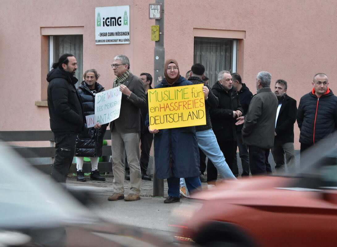 Zur Mahnwache am Dienstagabend vor der Moschee in der Karl-Jaggy-Straße kamen mehr als 20 Menschen zusammen. FOTO: MEYER
