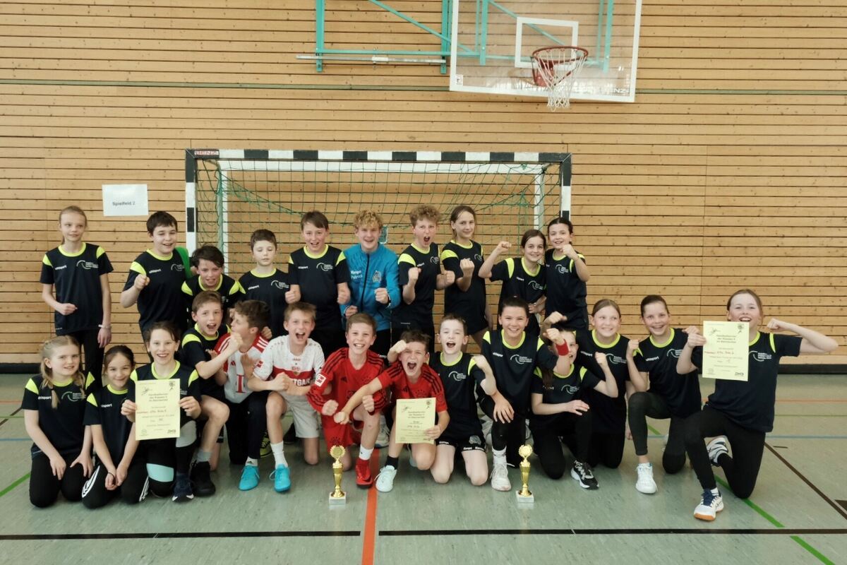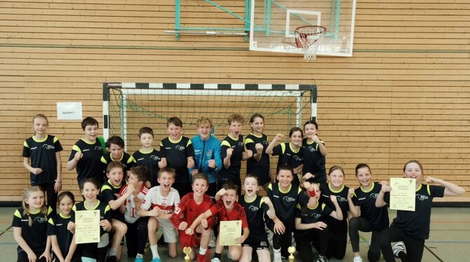 Ob von der Tribüne oder auf den Bänken in der Halle, die Schüler fiebern mit. Es befinden sich auch Eltern unter den Zuschauern. Zu Besuch kam dieses Mal zudem der Turniererfinder und Gründer des Mentorenmodells Gerhard Schmidt. Seit 9 Uhr wird gespielt. Nach fast 180 Spielen in beiden Hallen - bei den Fünftklässlern jeweils acht Minuten und bei den Sechstklässlern jeweils zwölf Minuten - steigt die Spannung und auch der Ehrgeiz. Die Schüler, die es bis zur Endrunde geschafft haben, geben nochmal alles. In der Jahnhalle, in der die Schüler der fünften Klasse spielen, gewinnt bei den Jungen die Mannschaft EFG Fritz des Firstwald Gymnasium und bei den Mädchen holt die Mannschaft EFG Fritz 2 - auch vom Firstwald Gymnasium - den Sieg. Die Sechstklässler spielen in der Steinlachhalle, wo die Mannschaften des Quenstedt-Gymnasium gewinnen - bei den Jungen die Mannschaft QG Mischner 4, bei den Mädchen die Mannschaft QG Mailänder 1. Es wird durch die Luft gesprungen, die Schüler freuen sich riesig. Bei der anschließenden Siegerehrung holen die jungen Handballer stolz ihre Pokale ab. Diese wurden vom Förderkreis Handball in Mössingen gesponsort. (GEA)