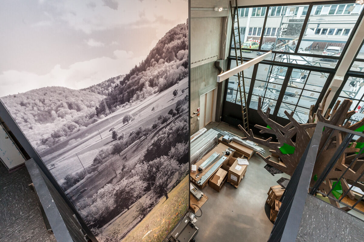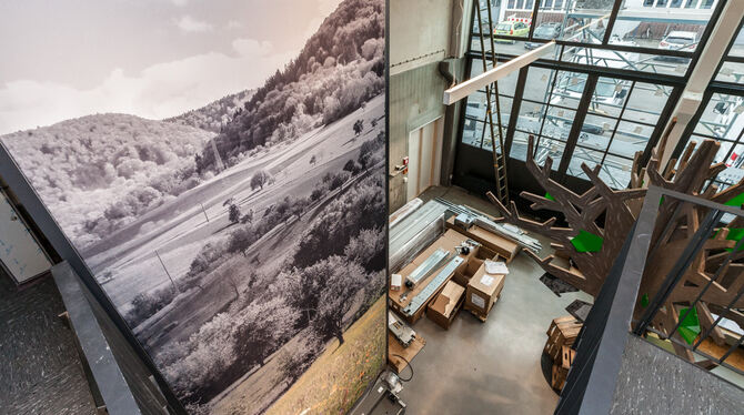 Wie vor drei Monaten nebenan ist in der ehemaligen Pausa-Werkstatt alles noch Baustelle. Der Aufzug wird eingebaut, leere Verpackungen liegen herum, ein Gerüst ragt vor der Glasfassade noch empor. Aber es wird: An den großen stilisierten Bäumen lässt sich bereits ausprobieren, wie weit man als stimmlich Halsbandschnäpper taugt oder wie schnell sich virtuell Äpfel pflücken lassen.