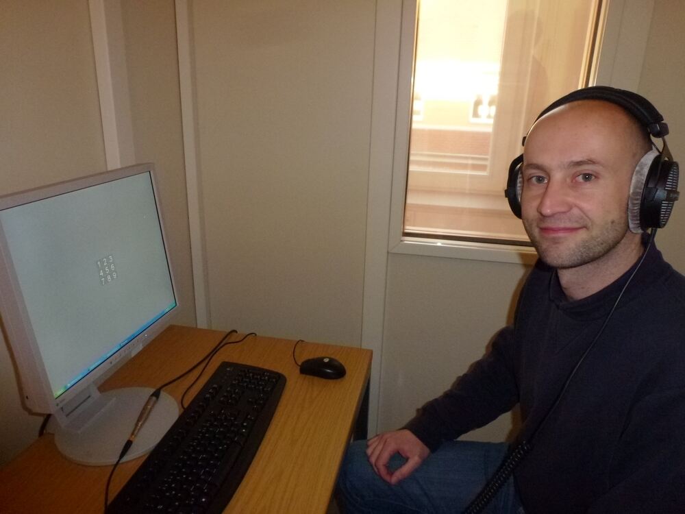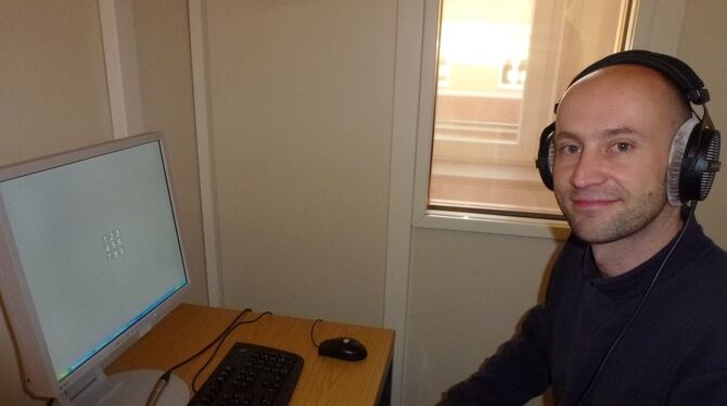 Der Tübinger Psychologe Florian Wickelmaier demonstriert in der schalldichten Kabine, wie das, was über Kopfhörer eingespielt wird und die Stille durchbricht, bei der Versuchsperson die Merkfähigkeit für Zahlen, die auf dem Computer ablaufen, beeinflusst. GEA-FOTO: LENSCHOW