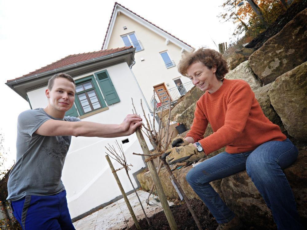 Der Student Marvin Mesenbrock und und die Vermieterin Charlotte Blessing arbeiten in Tübingen gemeinsam im Garten.