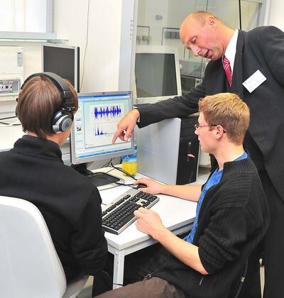 Professor Uwe Ilg erklärt Dirk Kanz und Horben Seliger (von links), wie man Töne sichtbar macht.