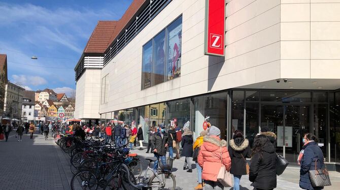 Gegen 13.30 Uhr stehen bei der Teststation am Modehaus Zinser rund 60 Menschen an. Vom Ende der Schlange bis zum Test dauert es rund 20 Minuten. Eine Wartezeit, die alle geduldig in Kauf zu nehmen scheinen. Die Sonne scheint an diesem Samstag, an dem deutschlandweit alle schon von der dritten Welle reden, gleich in mehrfacher Hinsicht auf Tübingen. Das macht die Wartezeit noch angenehmer. 300 Tests haben die Mitarbeiter an dieser Station heute schon gemacht, seit vier Stunden sind sie im Einsatz.