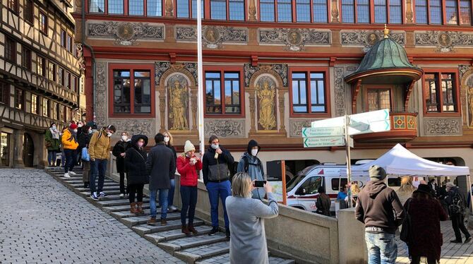 Am längsten steht man an diesem Samstag vor der Teststelle an der Kelter an. Eine junge Frau aus Böblingen berichtet von mehr als 45 Minuten Wartezeit, bis der Test gemacht wird. Sie ist gemeinsam mit ihrem Freund heute nach Tübingen gekommen und lacht trotz der Wartezeit gut gelaunt: »Passt doch, alles gut.« (GEA)