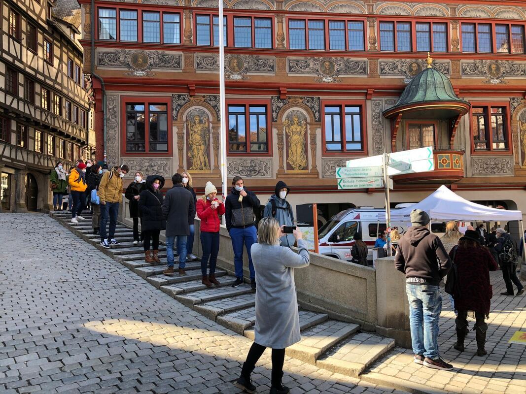 Auf der Neckarmauer sitzen Gruppen junger Menschen, auf der Platanenallee flanieren Familien - würden nicht die meisten Menschen eine Maske tragen, könnte man meinen, alles wäre wieder beim Alten in Tübingen. Zwei positive Tests haben die Mitarbeiter der Teststation in der Neuen Straße beim Modegeschäft »Tally Weijl« heute bislang zu verzeichnen, 360 Tests haben sie bis 13.50 Uhr insgesamt gemacht. Zusätzlich zum Modellversuch ist auch noch der normale Markttag in Tübingen, in den Straßen der Innenstadt ist also einiges los. Wenige Meter weiter, am Rathaus, stehen dutzende Menschen vor malerischer Kulisse für ihren Schnelltest an. Ebenfalls zwischen 300 und 350 Tests wurden an dieser Station heute bis zur Mittagszeit schon gemacht.