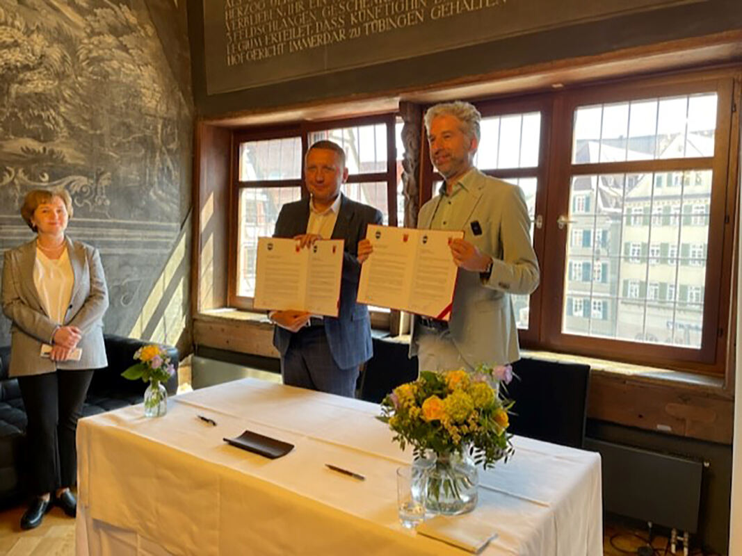 Unterzeichnet wurde der Vertrag im Tübinger Rathaus in dem Saal, in dem früher das Hofgericht beherbergt war. Oberbürgermeister Boris Palmer griff dies auch in seiner Begrüßung auf. Die Wände des Raumes sind mir Gemälden geschmückt, die eine Seite des Raums steht für die Gerechtigkeit, die andere für die Weisheit, die den Lenkern von Völkern gewünscht wird. »Beides wünsche ich von Herzen der Ukraine«, sagt Palmer.