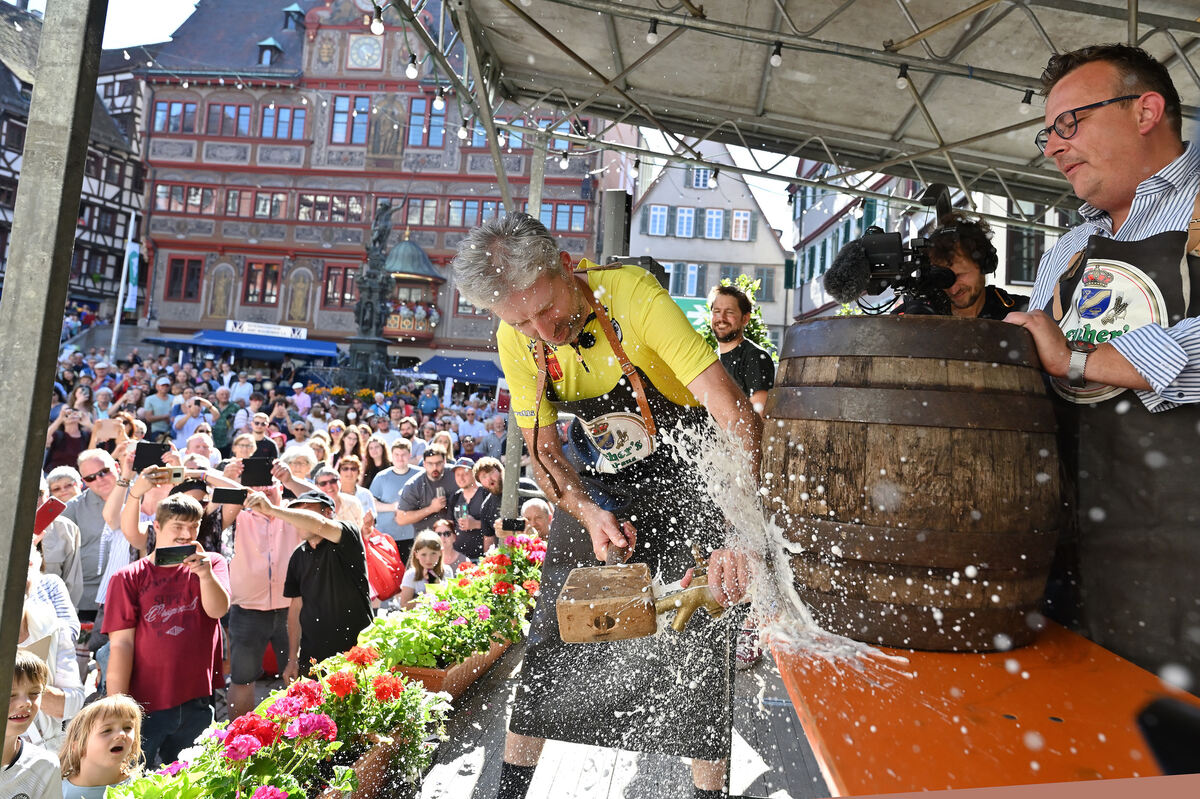 Dieses war der zweite Streich: Boris Palmer beim Fassanstich. Beim dritten Schlag saß der Zapfhahn dann schon fast stabil.