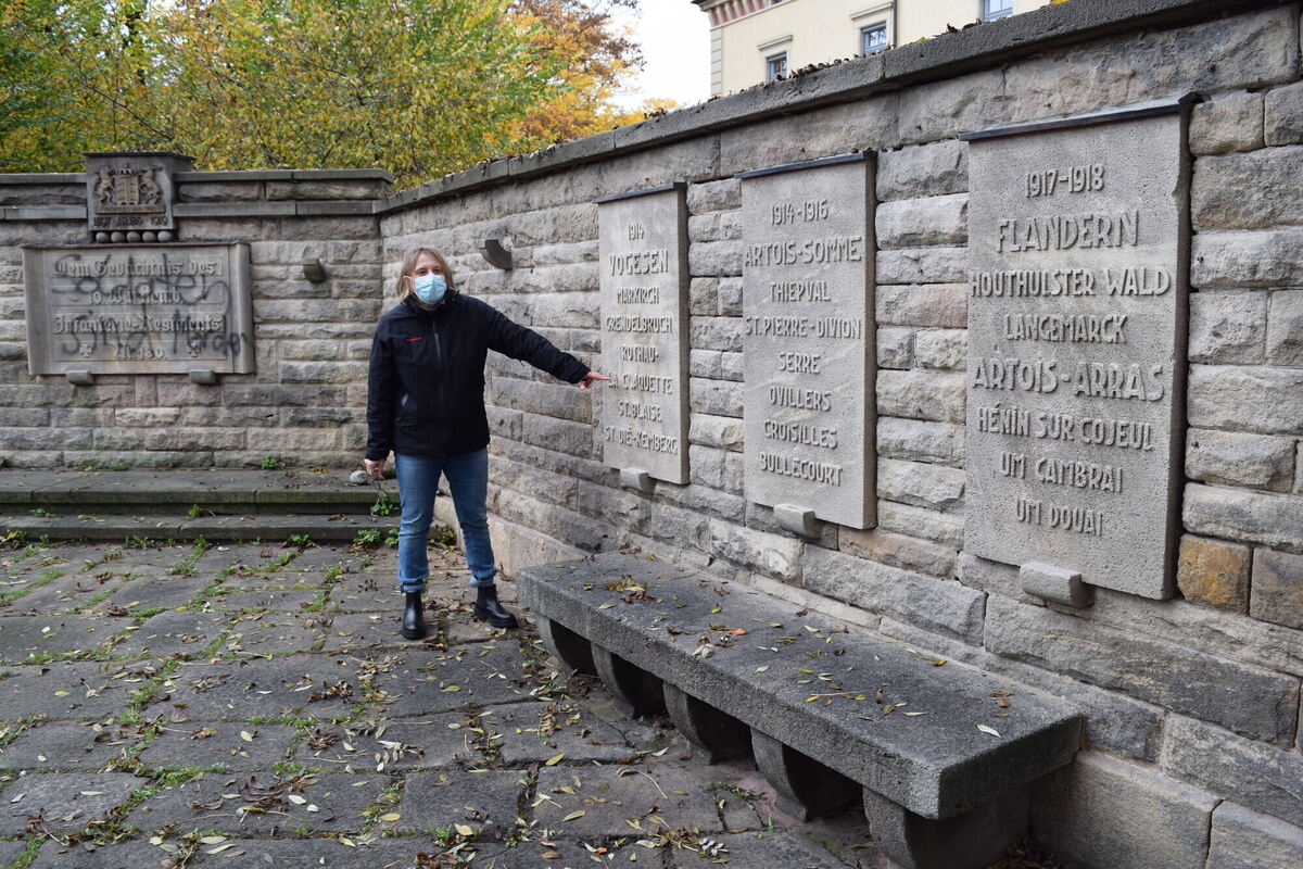 Dagmar Waizenegger, Leiterin des Fachbereichs Kunst und Kultur in Tübingen, zeigt die Schäden am Denkmal für das 10. Württembergische Infanterieregiment. FOTO: JAENSCH