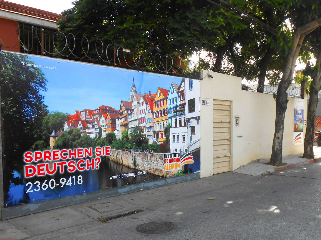 Dank einer alten Freundschaft zum Leiter der Sprachschule Hartmut Schostak kam Barbara Honner vom Verkehrsverein Tübingen, die als Autorin selbst einige Zeit in Guatemala verbrachte, dem Wunsch nach einem ihrer Tübingen-Fotos liebend gerne nach. Die fünf Meter lange und 2,5 Meter hohe Vinylplatte befindet sich an der Außenmauer der Sprachschule in der sogenannten »Zona Viva« (Zone 10), einem lebendigen Geschäftsviertel, das schon immer als eines der »sichersten« Stadtteile der Hauptstadt galt.