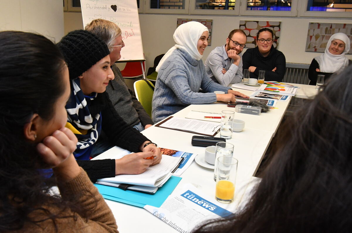 Was ist Heimat? Das diskutierten Fatima Salehi, Michael Seifert, Oula Mahfonz und Boris Kühn (von links) mit Migranten und Steinlachtälern. FOTO: MEYER