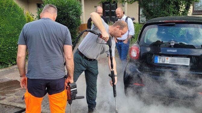 Bis zu einem halben Meter tief dringt die Löschlanze ein, ehe es den Ameisen mit kochend heißem Wasser und mächtig viel Dampf an den Kragen geht.