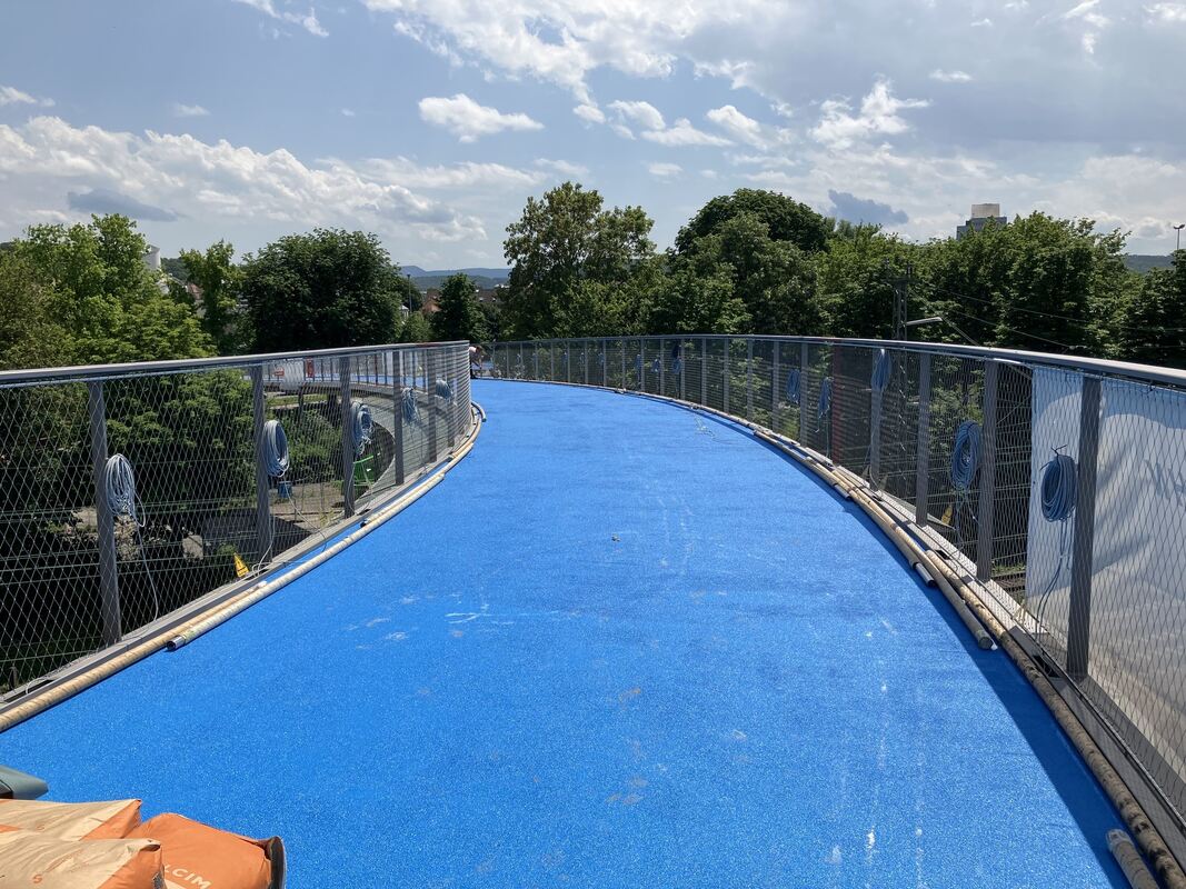 Bei ihren neuen Radbrücken geht die Stadt Tübingen einen anderen Weg. Sie sind - wenigstens dem Namen nach - Brücken in die Partnerstädte. Die Erste war die Ann-Arbor-Brücke, die das Behördenviertel in den Mühlbachäckern mit dem Anlagensee und den Gymnasien auf der anderen Seite der Bahngleise verbindet.