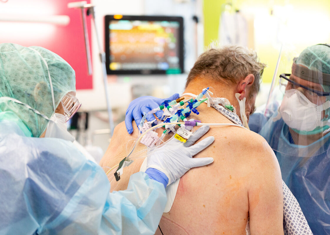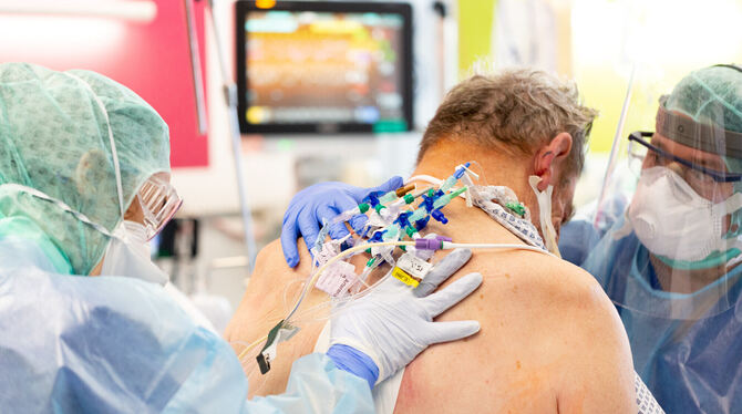 Versorgung eines Corona-Patienten auf der Intensivstation am Uniklinikum Tübingen. FOTO: UNIVERSITÄTSKLINIKUM TÜBINGEN/TOBIAS WUNTKE